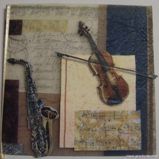 | Karte in 3-D Serviettentechnik (Aufbau mit Tonkarton). Komplett mit Couvert, Einlegeblatt und Satinband. Karte in Cellophanhülle. Grösse 15,5 x 15,5 c
