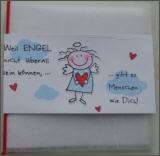 | Karte in 3-D Serviettentechnik (Aufbau mit Tonkarton). Komplett mit Couvert, Einlegeblatt und Satinband. Karte in Cellophanhülle. Spruch auf Karte " Weil Engel nicht überall sein können, ... gibt es Menschen wie Dich!" Grösse 15,5 x 15,5 cm