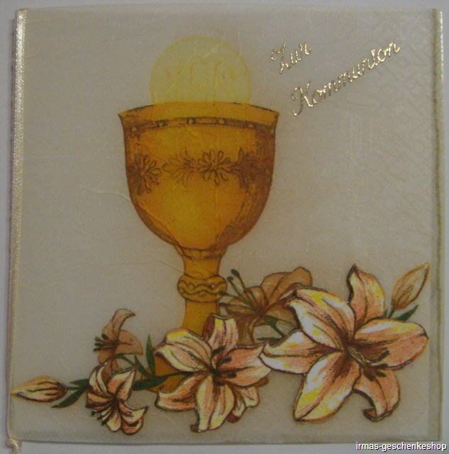 | Karte in 3-D Serviettentechnik (Aufbau mit Tonkarton) mit Schriftzug "Zur Kommunion" Komplett mit Couvert, Einlegeblatt und Satinband. Karte in Cellophanhülle. Grösse 15,5 x 15,5 cm