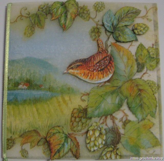 | Karte in 3-D Serviettentechnik (Aufbau mit Tonkarton). Komplett mit Couvert, Einlegeblatt und Satinband. Karte in Cellophanhülle. Grösse 15,5 x 15,5 cm