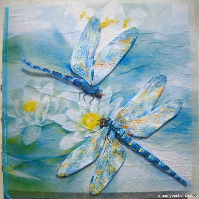 | Karte in 3-D Serviettentechnik mit Tonkarton und Pastellglitzer. Komplett mit Couvert, Einlegeblatt und Satinband. Karte in Cellophanhülle. Grösse 15,5 x 15,5 cm