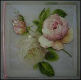 Karte in 3-D Serviettentechnik (mit Tonkarton). Komplett mit Couvert, Einlegeblatt und Satinband. Karte in Cellophanhülle. Grösse 15,5 x 15,5 cm |