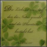 Karte in 3-D Serviettentechnik (Aufbau mit Kügelchen). Komplett mit Couvert, Einlegeblatt und Satinband. Karte in Cellophanhülle. Spruch auf Karte " Die Liebe ist ein Stoff, den die Natur gewebt und die Phantasie bestickt hat." Grösse 15,5 x 15,5 cm |